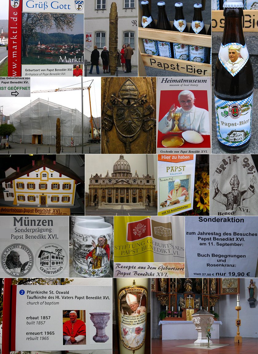 Benedikt ist überall. Jeder Laden hat etwas Päpstliches zu