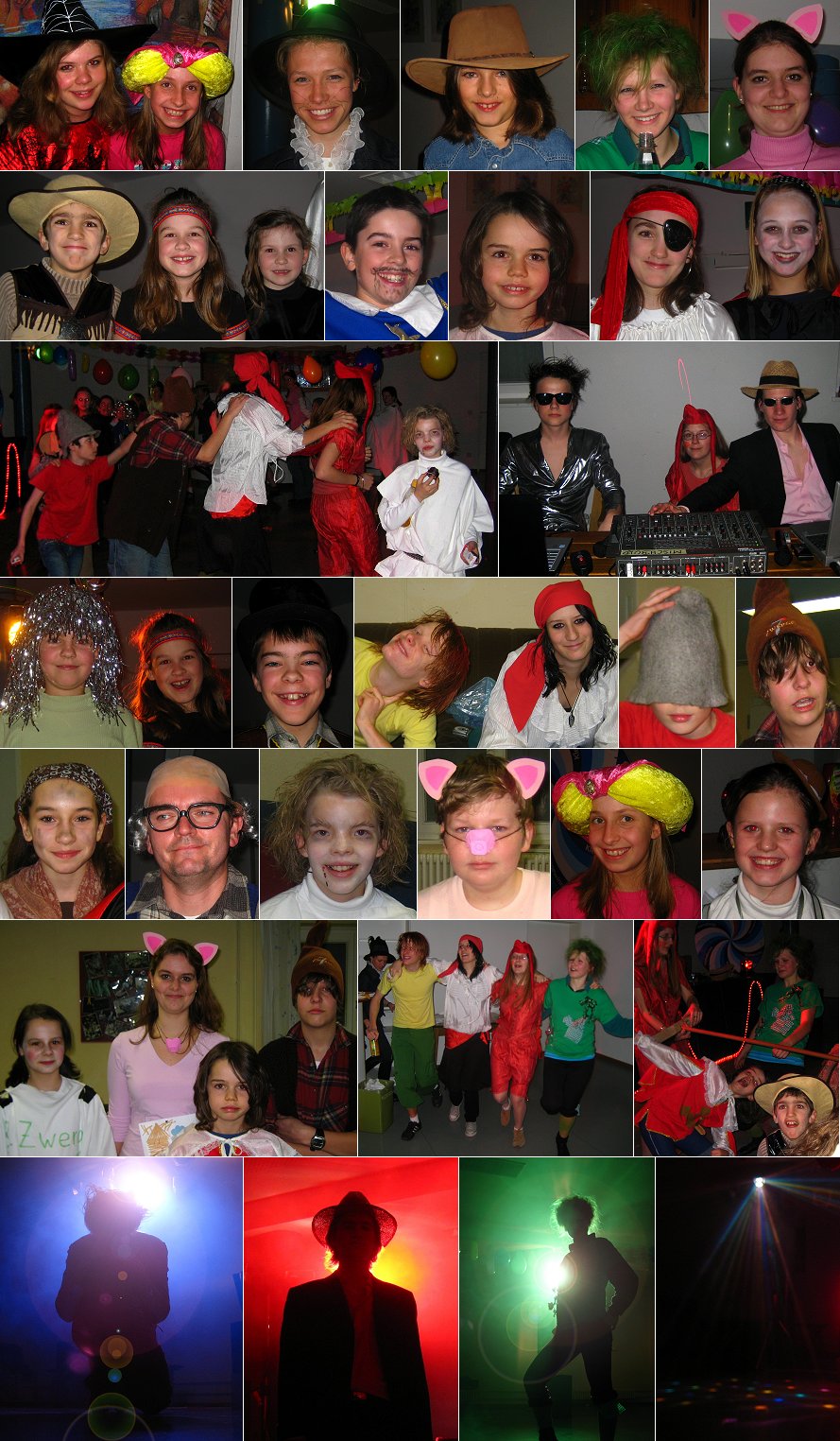 2008 Alle Jahre wieder kommen sie in den Pfarrkeller. Die Ritter und Vampire, die Zwerge, Indianer und Piraten. Diesmal waren auch Cowboys, Silberlocken, Schweinchen, Ärzte, Monster, Glatzköpfe und Tänzer mit dabei. Und wieder wurde es eine gelungene Party, die unsere Gruppenleiter auf die Beine gestellt haben. ![]() Das blaue und das grüne Bild in der letzten Reihe hat mir der Julian L. nachbearbeitet |
