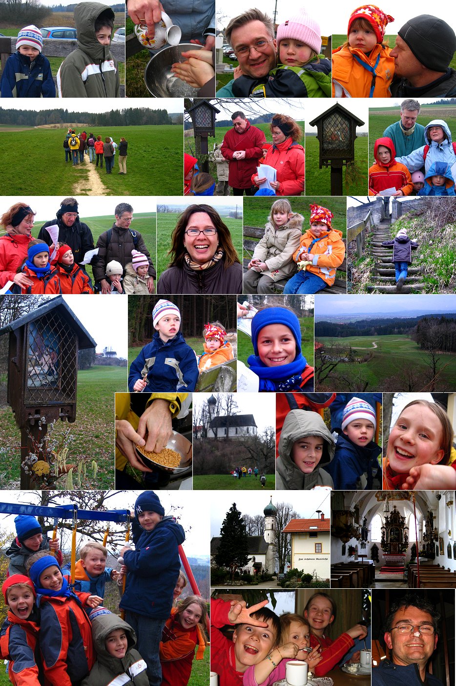 mit dem Familienkreis Sechs Familien unseres Familenkreises wanderten zusammen mit Pfarrer Wolf den wunderschönen Kreuzweg von Maxhofen nach Kleinhöhenrain. 60 Minuten durch abwechslungsreiche, herrliche Landschaften. Ein Geheimtipp: bei Sonnenschein und Fernsicht werden wir es wiederholen. ![]() |