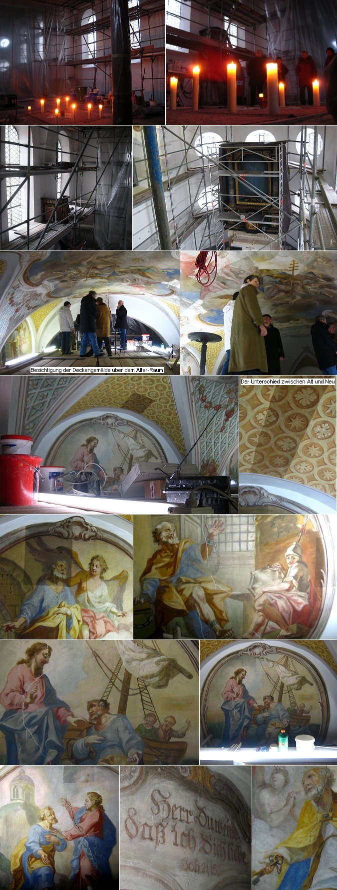 auf der Arbeitsbühne unter der Kirchen-Decke umzusehen, die Renovierungen