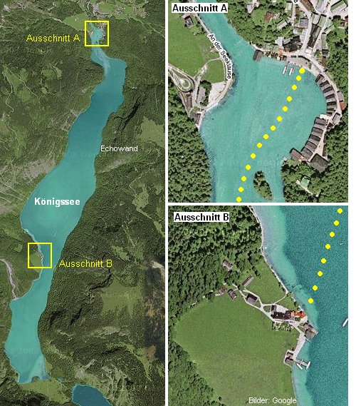 Von Schönau (Ausschnitt A) bis St. Bartholomä (Ausschnitt B) sind es bissl mehr als 5 Kilometer über den See. Im Sommer kann man St. Bartholomä nur per Schiff erreichen, oder über eine "kleine" Bergtour unterhalb des Watzmanns entlang, mit mindestens 800 Höhenmetern. Direkt am See führt kein Weg entlang.