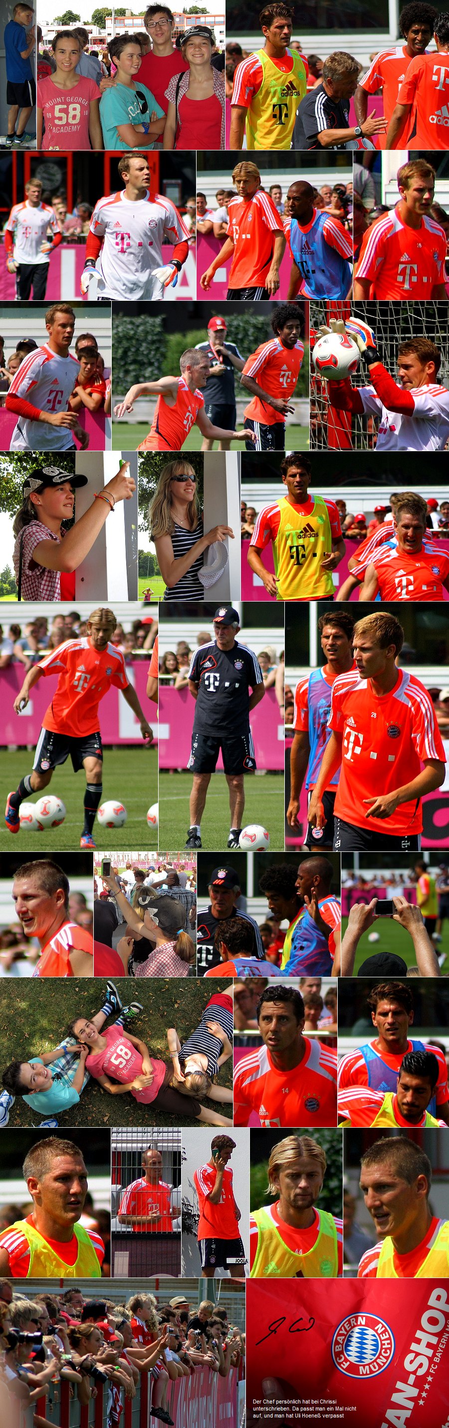 Ziele und sich entsprechend verstärkt. Nur für den Fall, dass man einige dieser Spieler in 5 Jahren nicht mehr kennt. Auf den Fotos sind folgende Spieler zu sehen: Manuel Neuer, Holger Badstuber, Jerome Boateng, Dante, Bastian Schweinsteiger, Anatoliy Tymoshchuk, Claudio Pizarro, Mario Gomez, Emre Can und Trainer Jupp Heynkes. Thomas Müller und Arjen Robben hatten auf dem Nebenplatz eine Art Sondertraining, man konnte sie gerade noch so erkennen. Thomas Müller musste zwischendrin mal telefonieren, wahrscheinlich musste er Gerd Müller wieder daran erinnern, seine Müller-Milch nicht auszutrinken. Mario