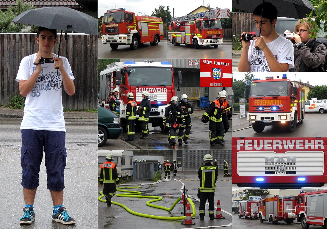 Samstag Morgen, 9 Uhr, im 60 Kilometer entfernten Olching. Luki und Julian filmen eine Übung der Feuerwehren Olching, Esting, Geiselbullach und Grasslfing. Hier gibt es sein Ergebnis: Ein zehnminütiger Einsatz-Film