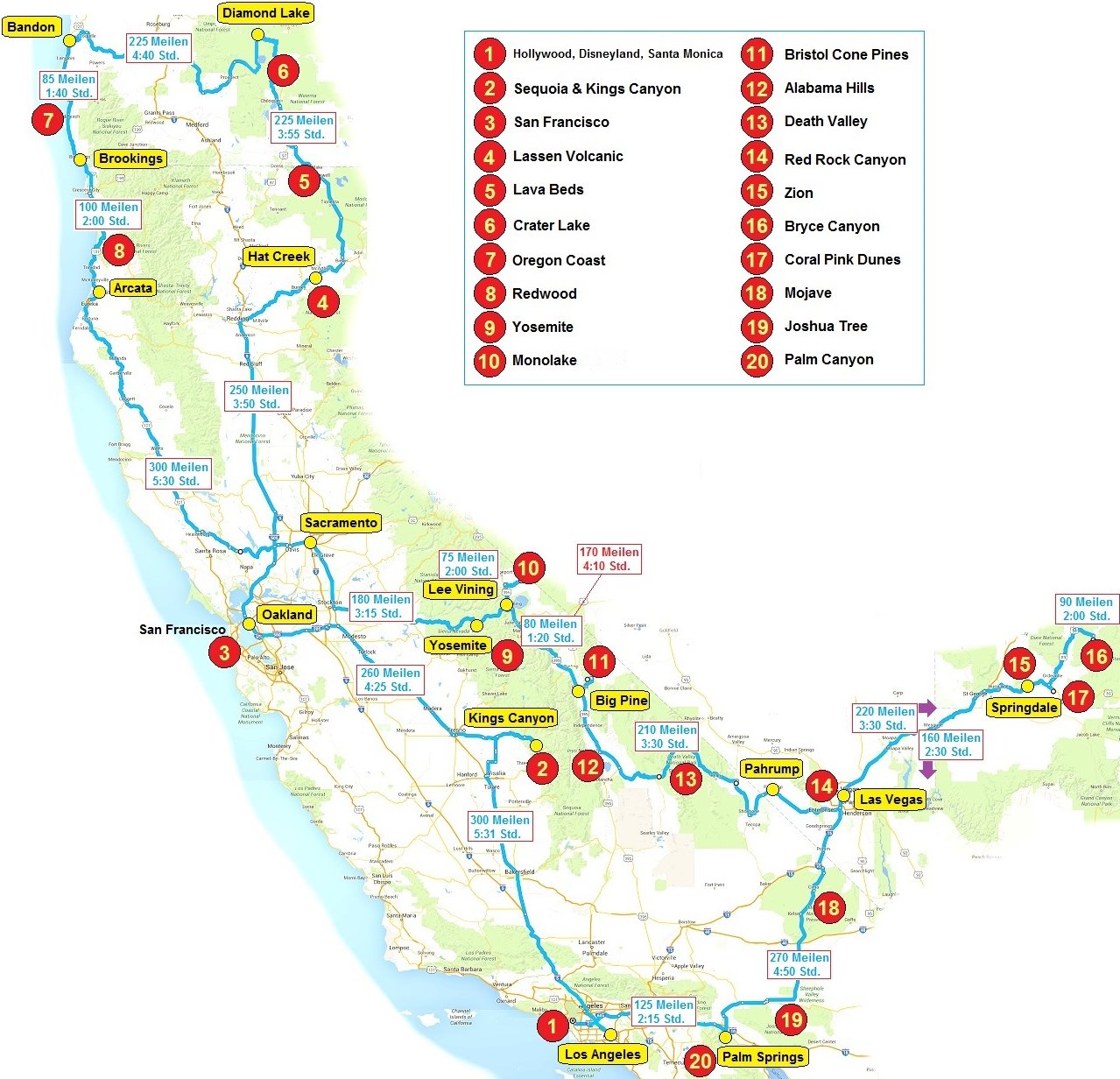 In den gelb eingerahmten Orten haben wir jeweils übernachtet