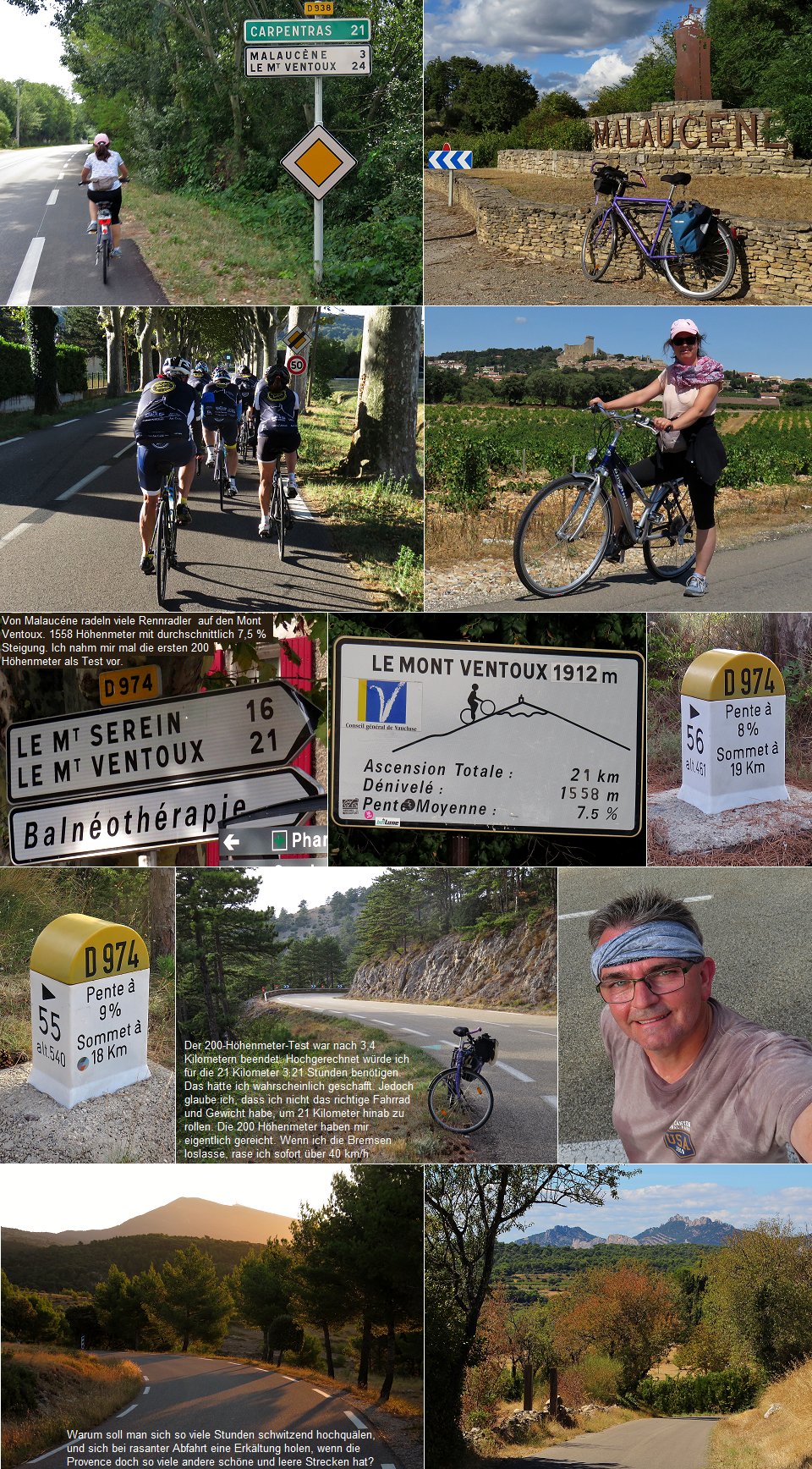 Radfahren in der Provence. Etwas schöneres gibt es kaum. Zweimal hatte ich Glück und wurde bergauf von einem Trupp Rennradfahrer überholt. Ich konnte mich jeweils für etwa 5 Kilometer in deren Windschatten hängen und sie zogen mich förmlich mit bis Malaucène. Plötzlich radelte ich bis zu 10 km/h schneller. Hätte ich nicht für möglich gehalten, das sowas echt klappt.