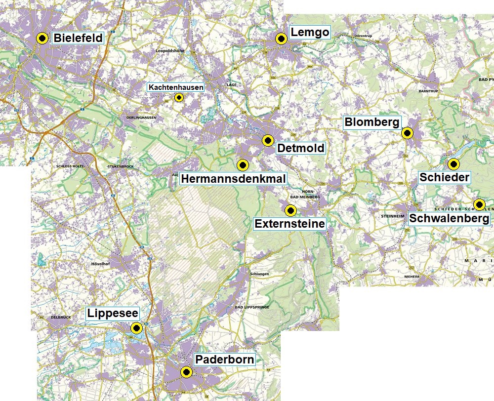 | Ein Kurzurlaub ist natürlich immer zu kurz. Am Freitag haben wir uns getroffen und nun ist schon Montag. Jörg und ich bleiben bis Dienstag in Schieder, doch Tömmi und Murphy fahren heute heim. Vorher schauen wir uns aber noch die Top-Sehenswürdigkeiten dieser Region an: Externsteine, Hermannsdenkmal und Detmold.