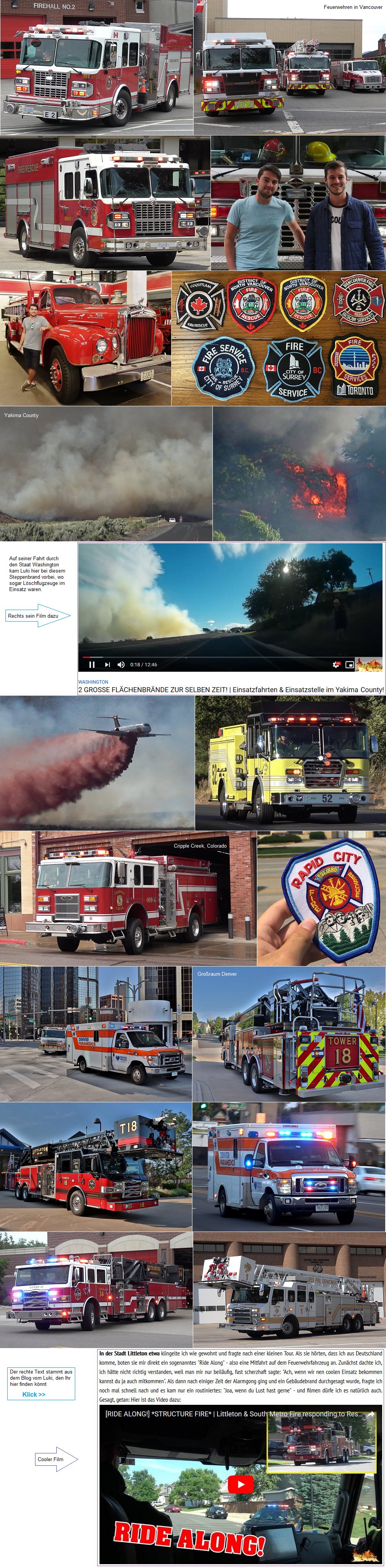 Für seinen Youtubekanal hat Luki nun in allen möglichen Feuerwachen Filme drehen können. Im mittleren Westen konnte er sogar richtige Pionierarbeit leisten, da dort niemand so ein Hobby betreibt und fast alle Wachen noch nie auf Youtube zu sehen waren. Nach und nach werden seine Filme erscheinen. Sensationell waren die sogenannten "Ride alongs", Filme, die er währen der Einsatzfahrt drehen konnte, weil die Feuerwehr in einfach mitnahm. Mehr dazu unten.