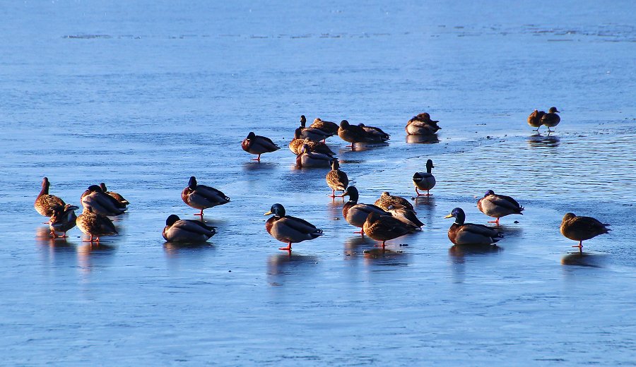 Die Enten, die vom Schwimmen auf dem kalten See erschöpft waren,