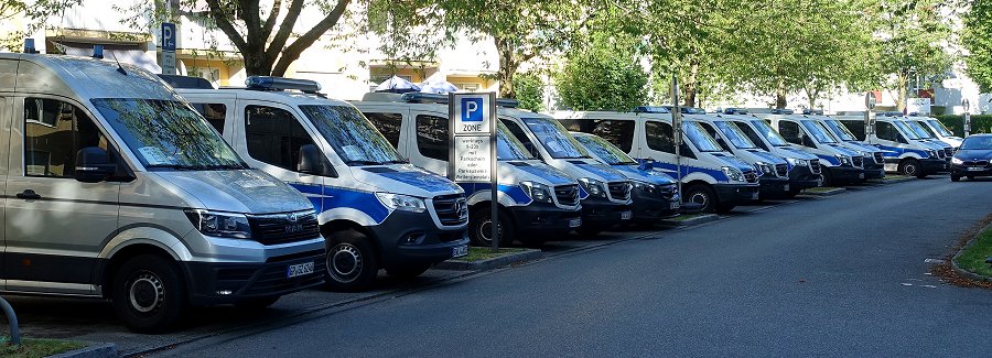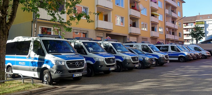 drei Straßen gekommen, wo die Polizei eine ganze Flotte Mannschaftsbusse