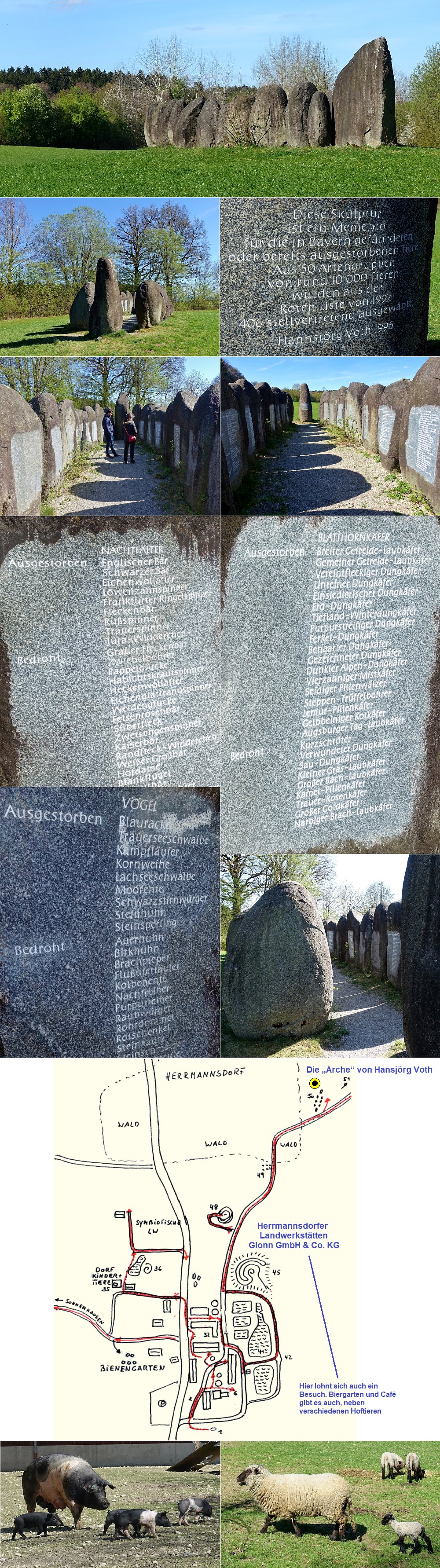 Folgender Text steht auf Seite 32 der Hermannsdorfer Kunstbroschüre ...>> Wir folgen dem Weg in den Wald, und nach zehn Minuten sehen wir mitten in der Weide die „Arche“ von Hansjörg Voth. 24 Granitfindlinge aus der Gegend von Passau, in der letzten Eiszeit in besonderer Weise geschliffen und geformt, wurden vom Künstler wie die Schiffsgräber aus der Bronzezeit in Nordeuropa zu einer Arche geformt. Als Memento mori für in Bayern gefährdete oder bereits ausgestorbene Arten sind in die Innenfläche der Findlinge 406 Namen aus der roten Liste von 1992 eingraviert. Der Künstler will uns damit sagen, dass, wenn eine Spezies oder Art ausgestorben ist, sie weg ist, und zwar endgültig. Die Wissenschaft beklagt seit Langem den Verlust von Artenvielfalt als Folge unseres intensiven agroindustriellen Systems.