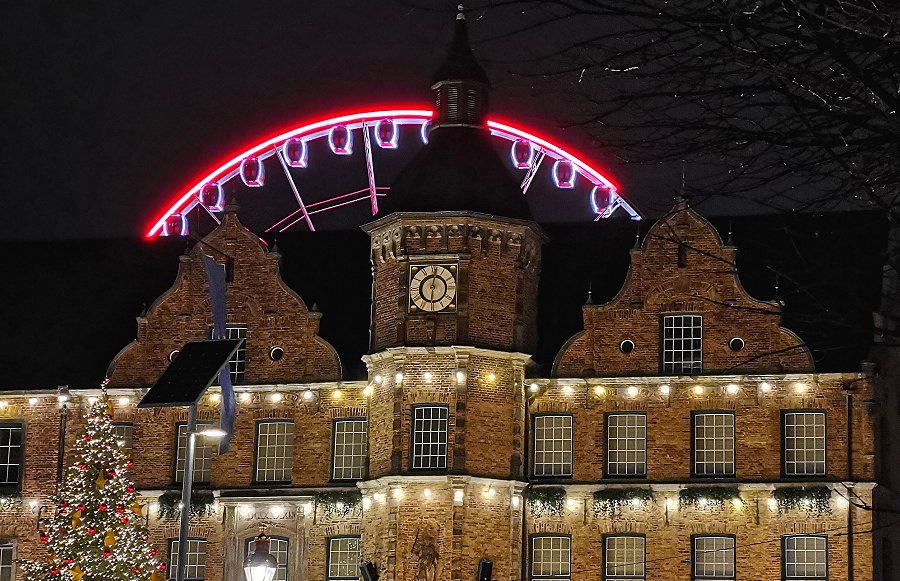 Das Düsseldorfer Riesenrad leuchtet hinter dem Rathaus. Gerne