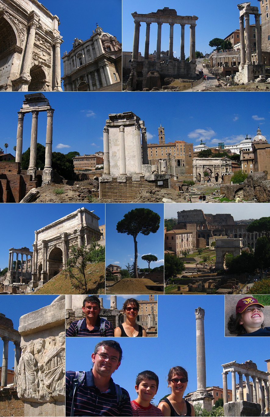 Vom Kapitol aus steigt man hinab ins Forum Romanum. Irgendwie ist es schon ein tolles Gefühl wenn man aus dem modernen Rom, an mittelalterlichen Kirchen vorbei zu den uralten Ruinen hinabsteigt. Plötzlich wird Geschichte lebendig. Drüben steigt man hinauf zum Palatin, dem Hügel, wo vor ca. 3.000 Jahren die ersten Siedlungen gegründet wurden und somit die Geschichte Roms begonnen hat. |