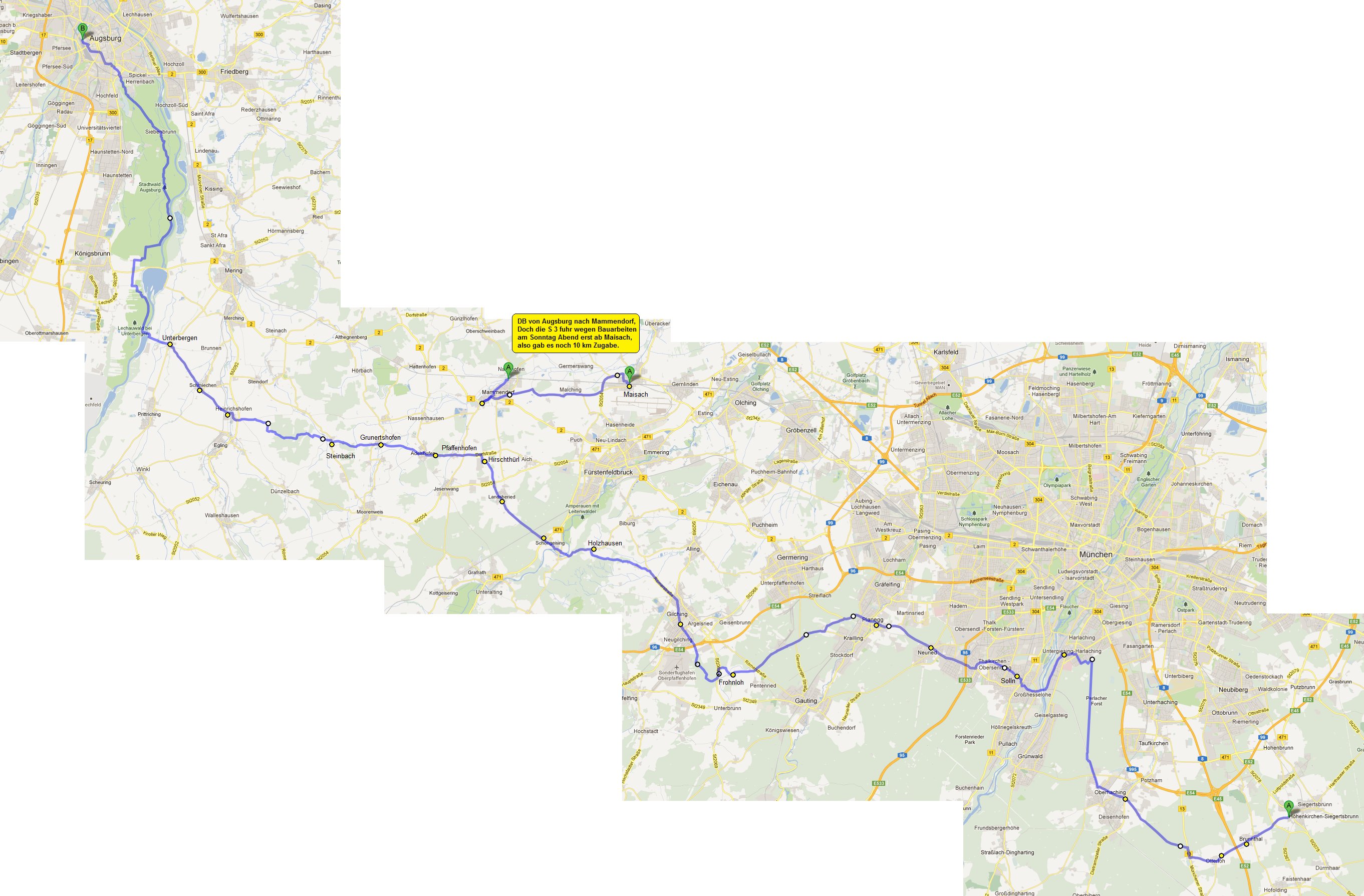 Die Route Höhenkirchen - Augsburg beginnt im Süd-Osten, also ganz links unten auf dieser Seite ...