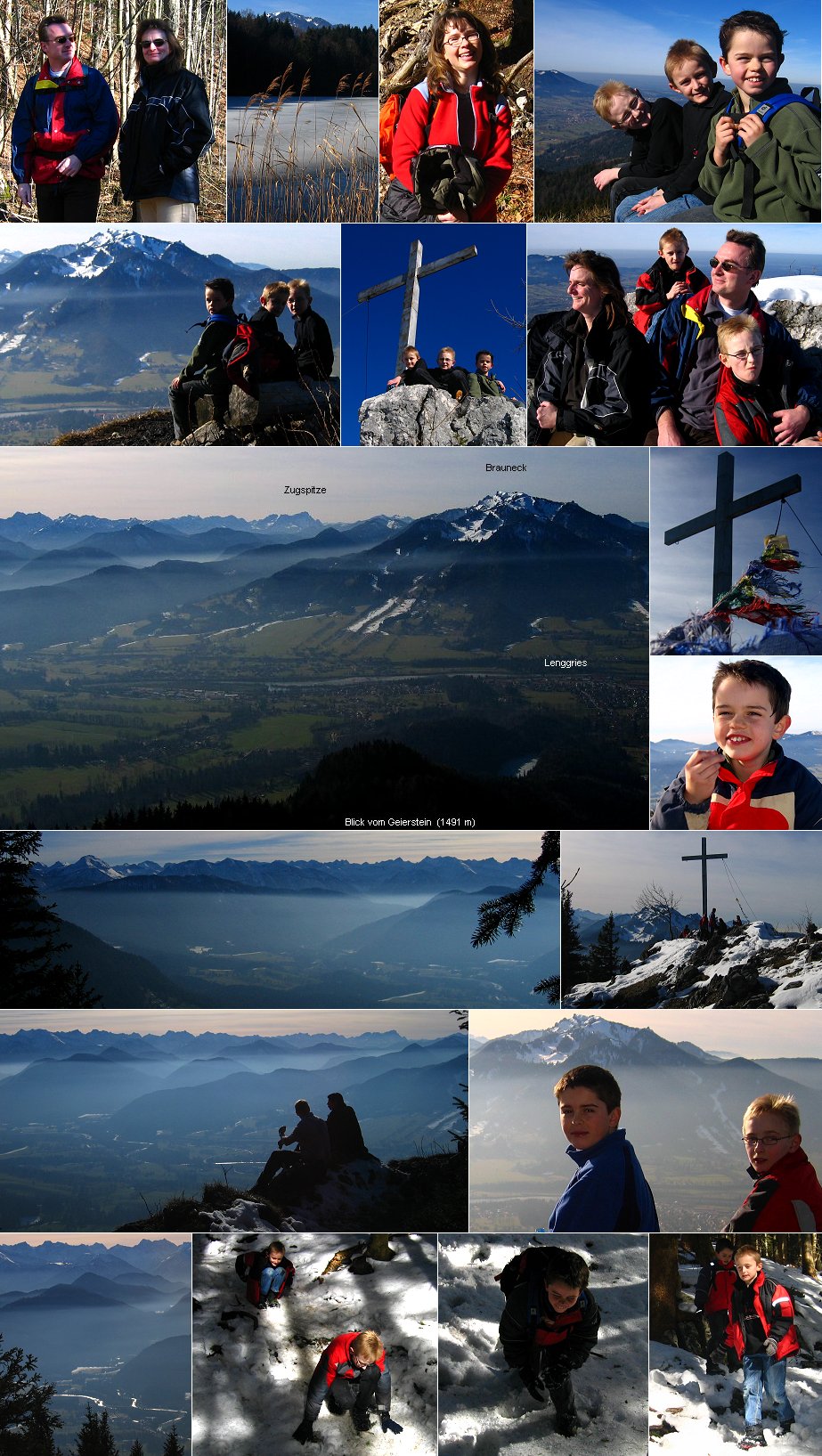 am Geierstein Das herrliche Bergwetter hält an. Erstmals waren wir mit der Familie Schnetter unterwegs. 800 Höhenmeter von Lenggries hinauf zum Geierstein (1491 m). Im oberen Teil überraschten uns sehr vereiste Wege. Erwachsene hatten "Sorgen", Kinder hatten Spaß und tolle Reflexe. Und die Aussicht .... was soll ich Euch sagen: Traumhaft, wie immer! ![]() |