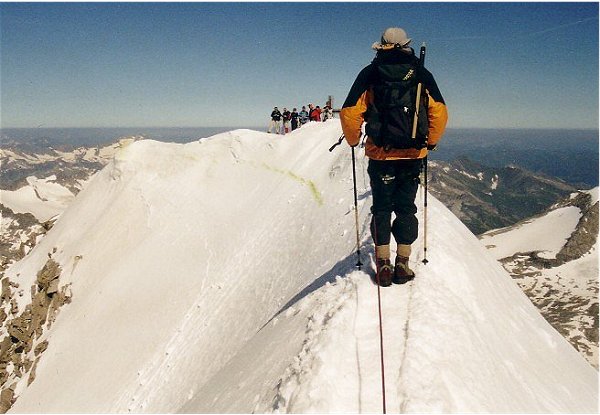 (3674 m) – Venediger Gruppe – 17. Juli 1985 Auf dem Gipfelgrat des Großvenedigers (3674 m). Obwohl es erst der 6. Gipfel meines Lebens war, war ich bis heute nie mehr auf einem höheren Berg gewesen. Dieses Bild hier ist aber 2002 von meinem Cousin Michael gemacht worden und zeigt mir, wie schön es hier oben sein kann. Andi,  und ich