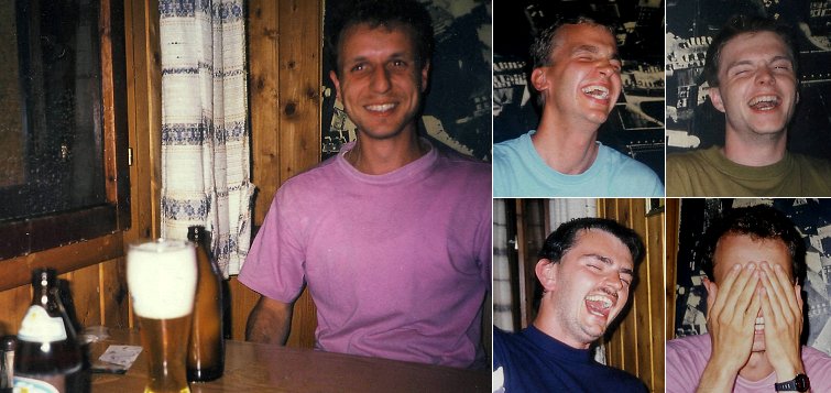 m) – Stubaier Alpen – 29. Juli 1991 Einen der lustigsten Abende gab es im Westfalenhaus in den Stubaier Alpen. Denkwürdiger Höhepunkt war Murphys "Weißbier-Löscheinsatz". Murphy schüttelte die Hefe in seiner Weißbierflasche, was ja grundsätzlich OK ist, nur .... 1.) War die Flasche noch halbvoll und 2.) schüttelte er die Flasche nicht hin und her, sondern hoch und runter, wie er es nach stundenlangem Würfeln vom Würfelbecher gewohnt war. Folge: Der geschüttelte Schaum baute einen Riesendruck in der Flasche auf, Murphys Daumen konnte nicht verhindern, dass der Schaum mit der Wucht eines Feuerlöschers gegen die Scheibe klatschte, und in einem hohen Bogen sogar noch die 3 Meter entfernte, gegenüberliegende Wand traf. Mit Servietten versuchte er das Fenster zu putzen, doch irgendwann zog er die Vorhänge einfach zu. Wir haben uns minutenlang totgelacht. Jörg lag ungelogen 10 Minuten, sich den Bauch haltend unter dem Tisch. |