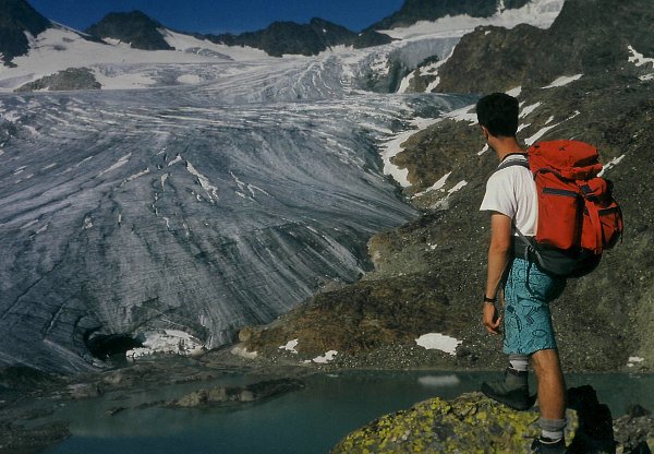 1991 Fast 2 Wochen lang waren Ecki, Murphy, Jörg und ich 1991 in den Stubaier Alpen unterwegs. Als es in Tirol begann sich einzuregnen, fuhren wir mit dem Bus übers Timmelsjoch auf die Südtiroler Seite der Stubaier Alpen – in die Sonne. Es kommt oft vor, dass der Alpenhauptkamm das schlechte Wetter in Tirol festhält und in Italien die Sonne scheint, wie man es ja gewohnt ist. Hier steht Murphy und schaut sich das Ende der Gletscher an, welche am Zuckerhüttl, mit 3507 Metern der höchste Berg in diesem Gebiet, beginnen. Wir waren auf dem Weg zum Becher (3191 m), meinem bisher letzten Dreitausender. Abends wurde natürlich auch wieder „gebechert“ – mit Würfeln und Weißbier auf der Teplitzer Hütte, diesmal etwas "trockener". |