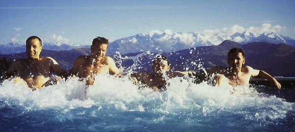 (1804 m) – Kitzbühler Alpen – 12. September 2000 Am Ende einer langen Tagesetappe durch die Kitzbühler Alpen erwartete uns an der Schönleitenhütte eine Erfrischung der besonderen Art. Ein Freibad auf 1800 Meter Höhe. Ob das Wasser kalt war oder nicht, egal, so eine Gelegenheit muss man nutzen – das wird man nie vergessen. Zusammen mit Andi, Bernd und Murphy versuchten wir nicht zu erfrieren, während Tömmi das Foto machte. Im Hintergrund die Glockner-Gruppe. |